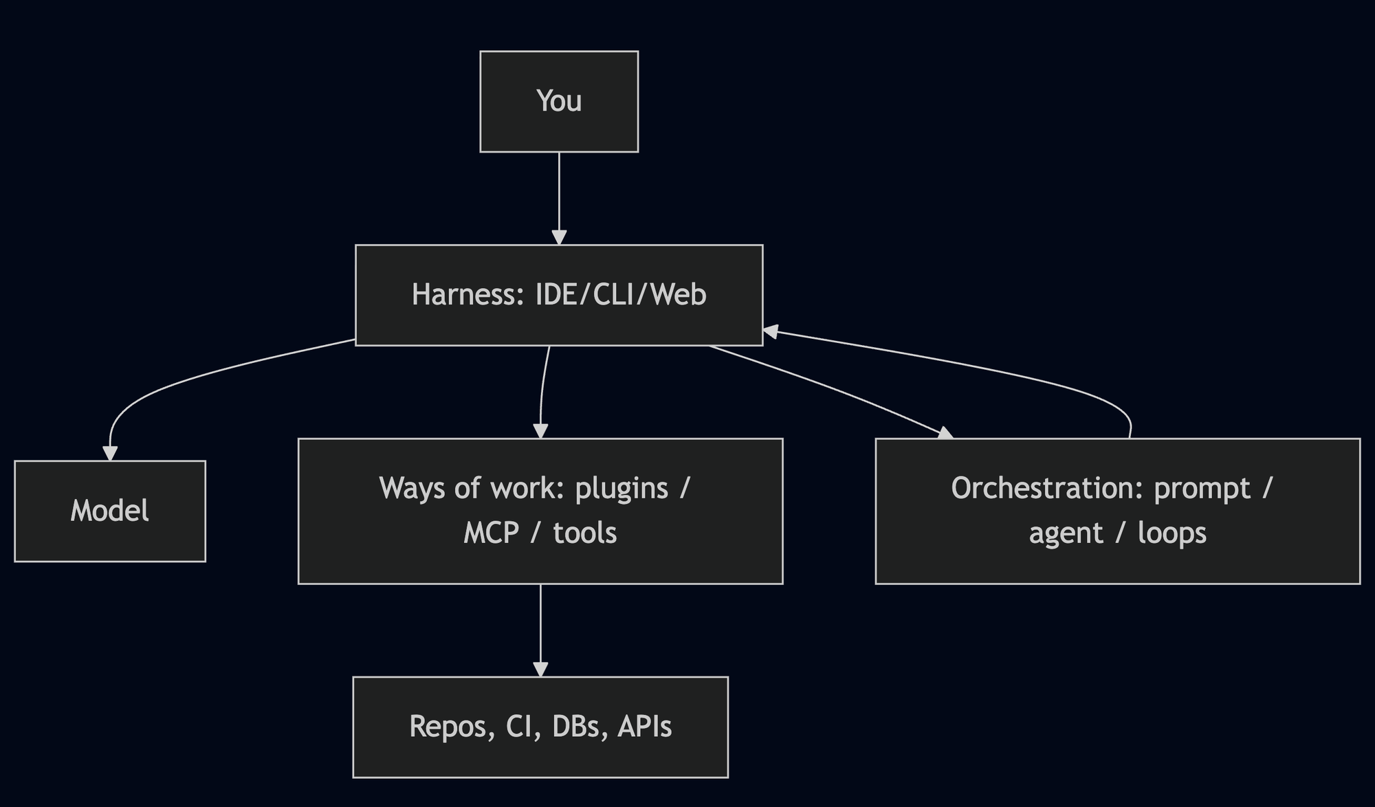 If you’re arguing “Cursor vs Copilot,” that’s a harness debate. If you’re arguing “Claude vs DeepSeek,” that’s a model debate. If you’re arguing “MCP,” that’s a ways-of-work debate.